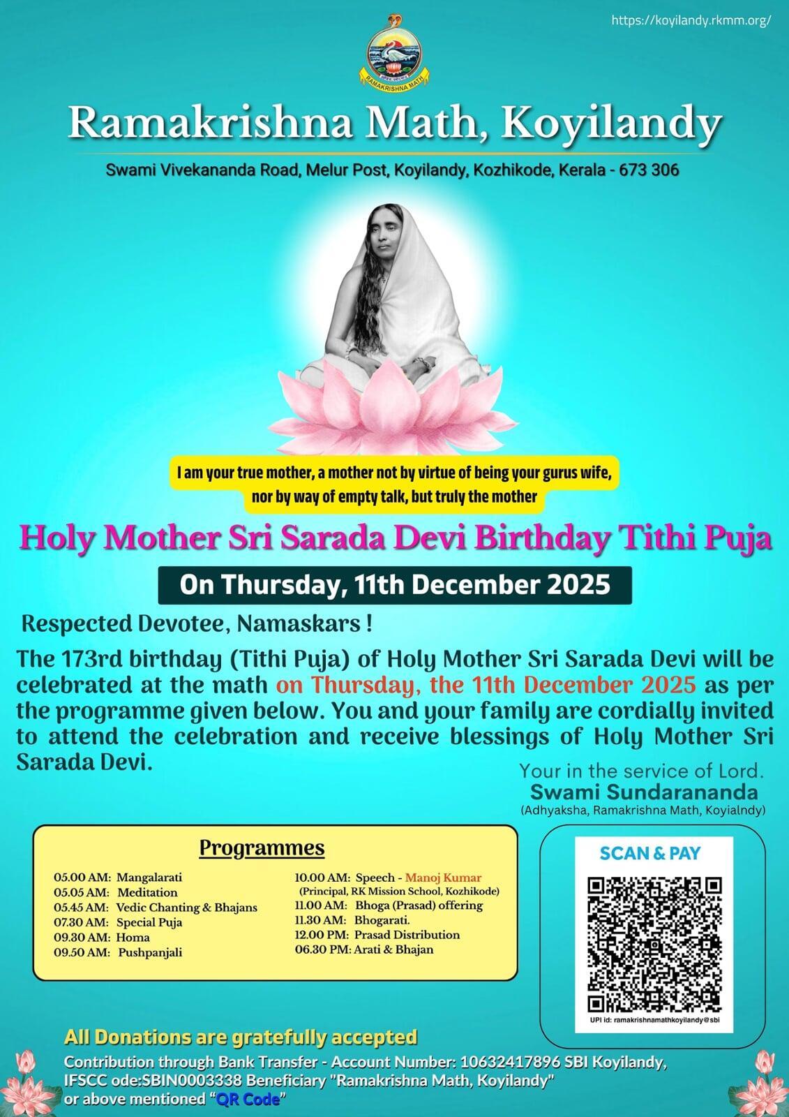The 171st Tithi Puja of Holy Mother Sri Sarada Devi was celebrated in our Math on Wednesday, January 2024. On this Holy occasion, a Special Puja, Homa was performed and Anna Bhog was offered, followed by Arati.
