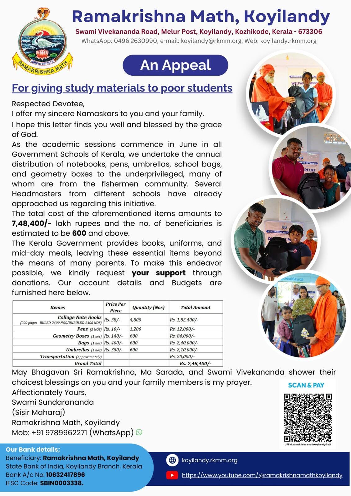 We humbly request you to contribute for this noble cause. All donations are exempted from Income Tax u/s 80G of IT Act 1962.You can send your donation by Cheque/Bank Draft drawn in favour of “Ramakrishna Math, Koyilandy” and send it via Registered Post or Courier to following address :-
